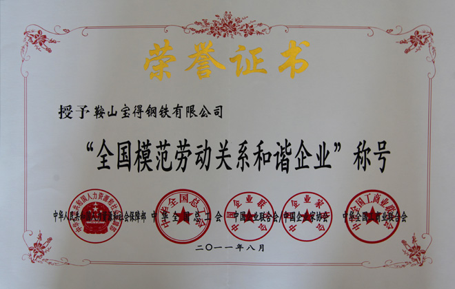 2011年8月15日,在北京召開的全國構(gòu)建和諧勞動關(guān)系先進表彰暨經(jīng)驗交流會上,公司被國家人力資源和社會保障部、中華全國總工會、中國企業(yè)聯(lián)合會、中國企業(yè)家協(xié)會、中華全國工商業(yè)聯(lián)合會表彰,并授予“全國模范勞動關(guān)系和諧企業(yè)”稱號。鞍山市僅寶得公司一家企業(yè)獲此殊榮。