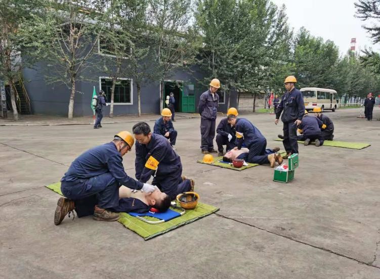 “報告馬廠長:我是當(dāng)班維護班長曹雷,9點35分左右班內(nèi)三名員工在煤氣閥組平臺巡檢過程中發(fā)生煤氣中毒事故,請求立即支援”……;“請搶險救援組、安全警戒組、醫(yī)療救護組…立即趕赴事故現(xiàn)場集結(jié)”;“報告總指揮:搶險救援組10人到達現(xiàn)場,6套呼吸器及3副擔(dān)架救援裝備完好,可正常使用”……;“各救援小組按預(yù)案規(guī)定程序及商定的實施方案,立即展開救援行動”……;“報告總指揮:三名傷者已成功救出,兩人中毒較重,一人較輕,……”;“報告總指揮:煤氣泄漏部位搶修完畢,已無泄漏現(xiàn)象,設(shè)備可正常運行”……。隨著一條條救援指令的下達,現(xiàn)場警戒、現(xiàn)場救援、傷員急救、設(shè)備搶修、現(xiàn)場清理及組織生產(chǎn)恢復(fù)等過程緊張、有序地完成,實戰(zhàn)演練圓滿結(jié)束。