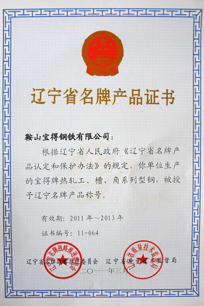 2011年3月,公司生產(chǎn)“寶得”牌熱軋工、槽、角系列型鋼,被遼寧省名牌戰(zhàn)略推進(jìn)委員會(huì)、遼寧省質(zhì)量技術(shù)監(jiān)督局授予“遼寧省名牌產(chǎn)品”稱號(hào)。
